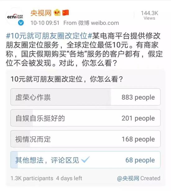 “修改朋友圈定位”对于有能力出国行的人来说,显然没什么必要,有需求的是那些没有能力和条件实现异地或境外打卡的人。根据央视网在新浪微博发起的投票“怎么看待10元就可朋友圈改定位”,绝大部分网友认为这是虚荣心作祟。